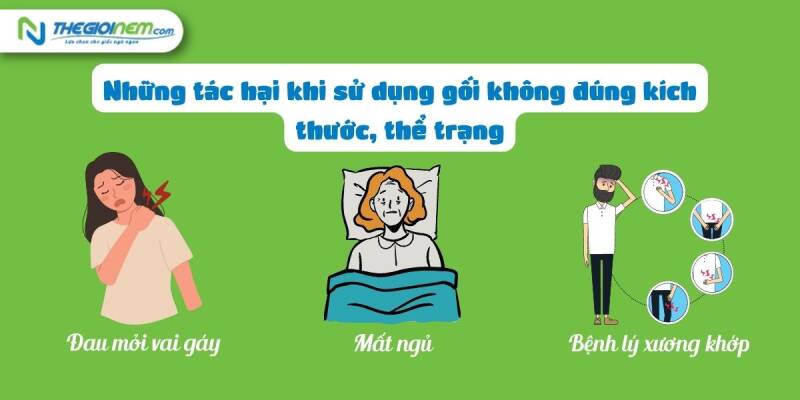 Nếu việc sử dụng gối ngủ không đúng kích thước, thể trạng trong thời gian dài sẽ ảnh hưởng nghiêm trọng đến giấc ngủ và cả sức khỏe của bạn. Sau đây là một số tác hại khôn lường khi chọn lựa gối nệm không phù hợp mà bạn nên biết: