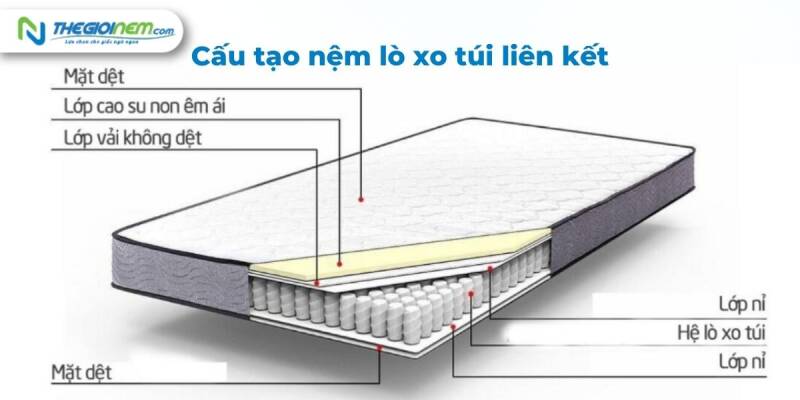 Cấu tạo nệm lò xo túi liên kết gồm nhiều lò xo có dạng hình đồng hồ cát. Tuy nhiên, điều đặc biệt là lò xo được dàn trải theo chiều ngang. Và mỗi hàng lò xo đều được bao bọc bởi một túi vải cao cấp. Với chất liệu thép không gỉ, khớp nối các ống lò xo không những có độ chắc chắn mà còn an toàn cho sức khỏe. Hiện sản phẩm này đang được phân phối tại Cửa hàng bán nệm lò xo chính hãng tại Tây Ninh.