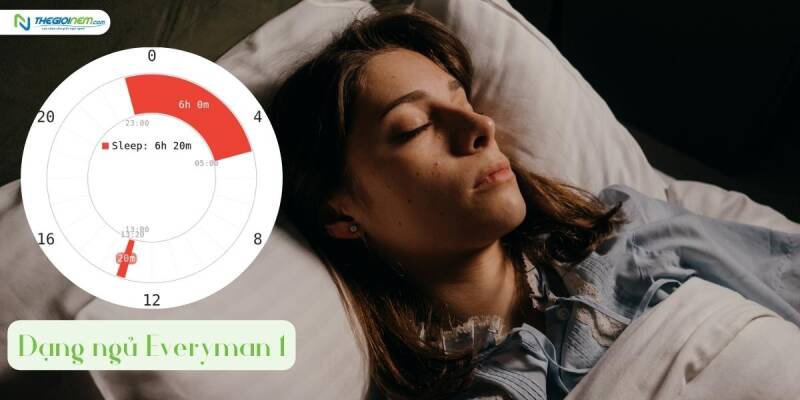 Tổng thời gian ngủ mỗi ngày của phương pháp ngủ Everyman 1 là khoảng 6 giờ 20 phút, chia làm 1 giấc ngủ dài và 1 giấc ngủ ngắn trong ngày. Tương ứng với giấc ngủ chính vào ban đêm và giấc ngủ ngắn vào đầu giờ chiều.