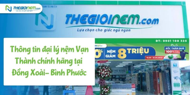 Thegioinem.com là hệ thông phân phối nệm chính hãng uy tín hàng đầu Việt Nam. Hiện nay đã có chi nhánh là đại lý nệm Vạn Thành chính hãng tại Đồng Xoài- Bình Phước. Nếu bạn có nhu cầu chăm sóc giấc ngủ thì hãy đến đây và trải nghiệm thử nhé. Các thông tin về địa chỉ cũng như sản phẩm sẽ được cập nhật ngay trong bài viết này, mời bạn cùng theo dõi ngay thôi nào!