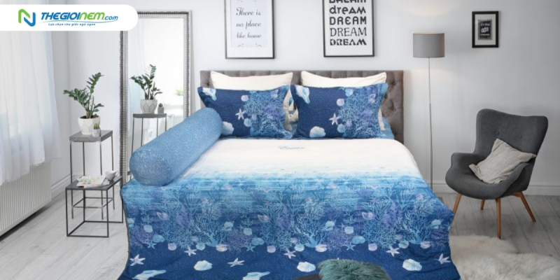 Màu xanh tự nhiên là đặc điểm chính của chăn ga gối theo phong cách nhiệt đới phương Tây. Đó là sắc xanh của đại dương, của thiên nhiên và của bầu trời. Một bộ chăn ga màu xanh dương là sự lựa chọn hoàn hảo để làm phong phú các gam màu trong căn phòng.