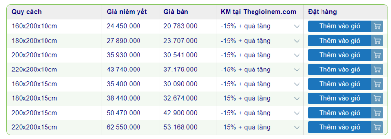 Bảng giá nệm cao su Liên Á được yêu thích nhất