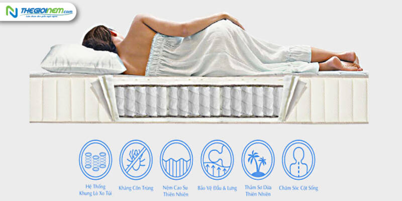 Nệm có độ cứng hợp lý cùng độ phẳng cao nên không gây đau lưng,không gây cong võng cột sống, có lợi cho quá trình tuần hoàn máu của người sử dụng. Ngoài ra, sản phẩm có độ nảy tối ưu cùng độ thông thoáng vượt trội, giúp tạo giấc ngủ ngon và sâu mỗi đêm.