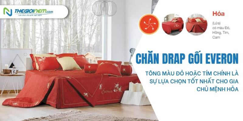 - Màu tương sinh: Hoả (lửa): màu đỏ, màu tím. Bạn mệnh Hoả nên sử dụng chăn ga gối nệmtông màu đỏ,màu hồng, màu tím ngoài ra kết hợp với các màu xanh (Thanh mộc sinh Hoả).